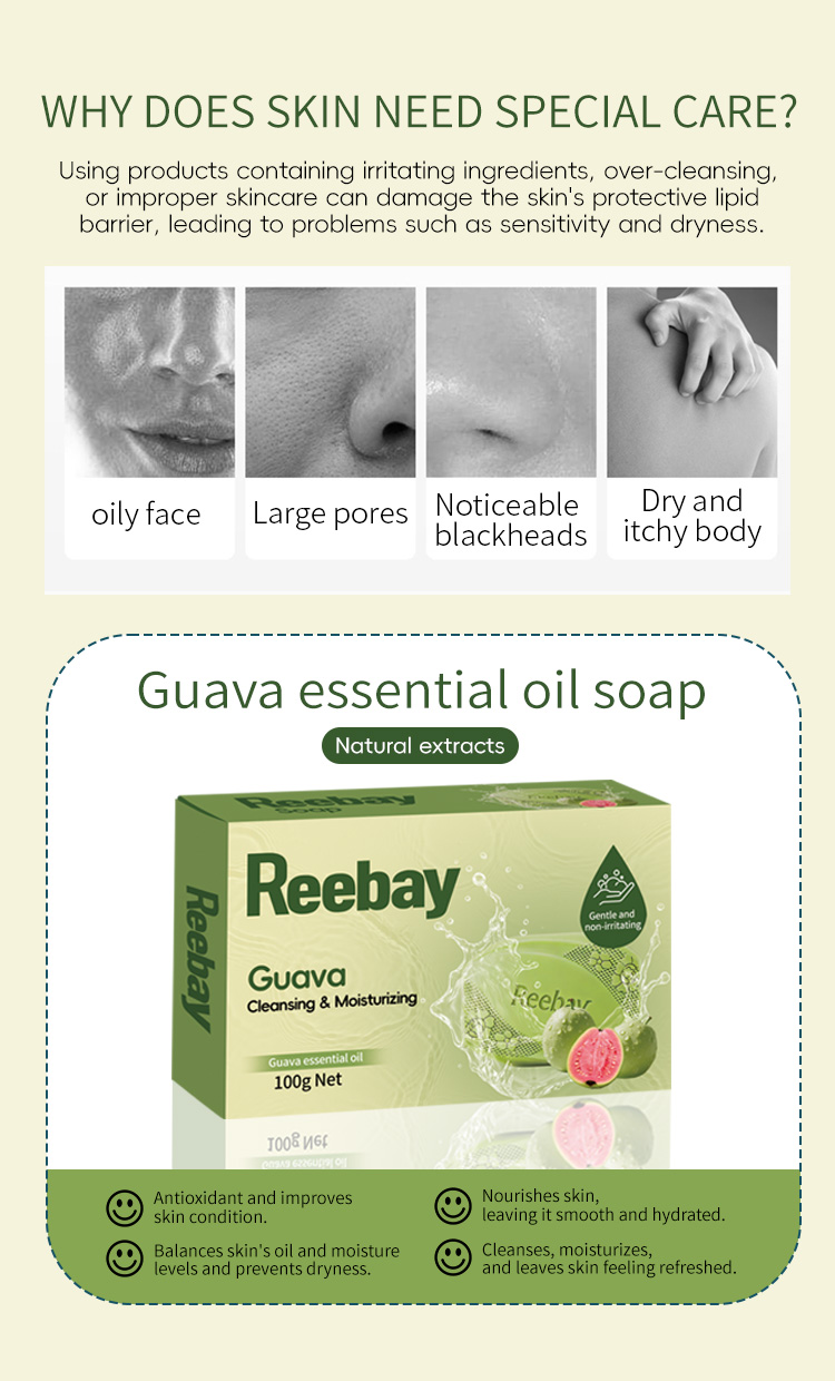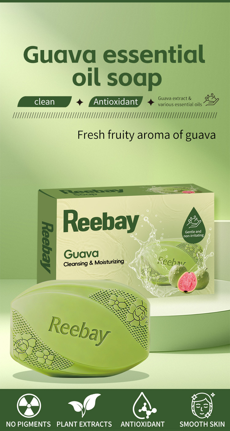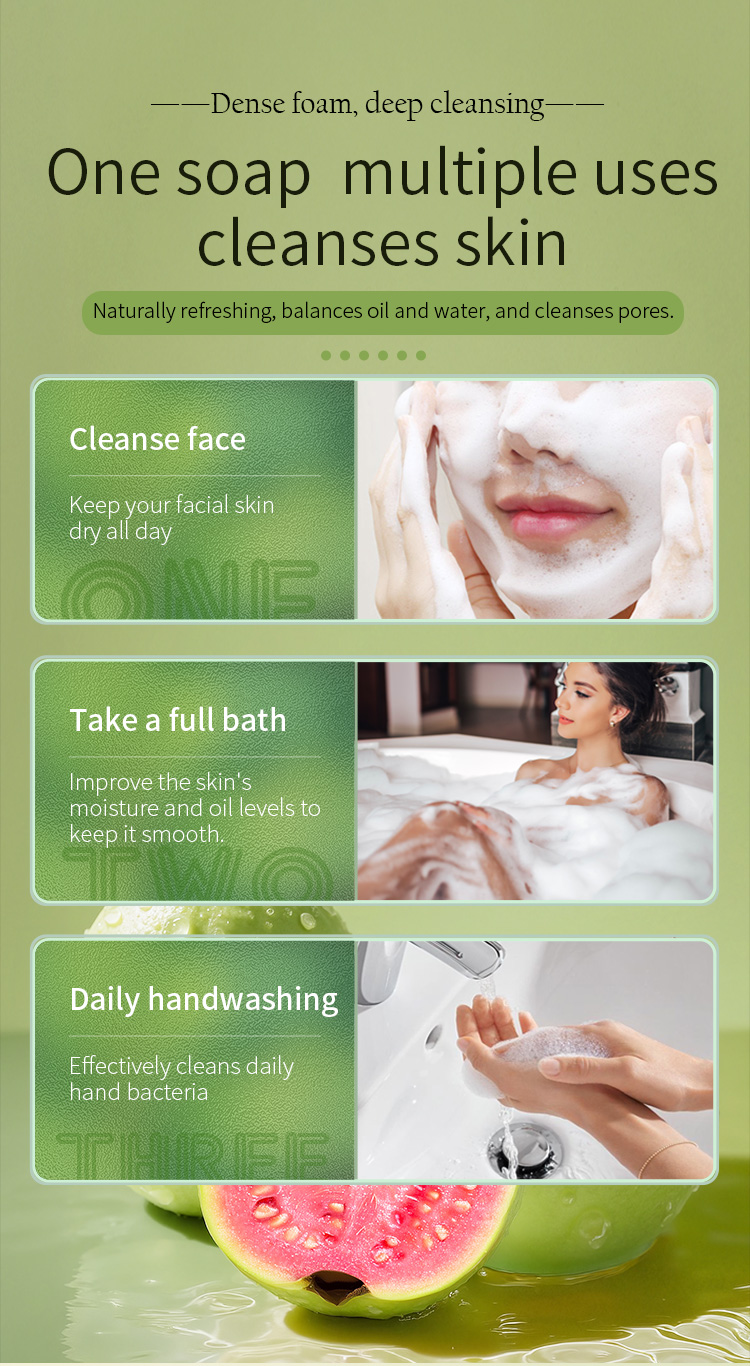 Guava essential oil soap, refreshing fruity scent, cleanses, moisturizes, and cares for skin; a multi-functional soap for face and body.