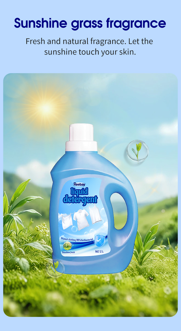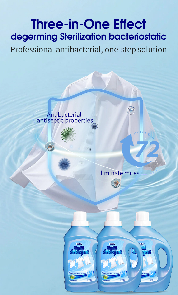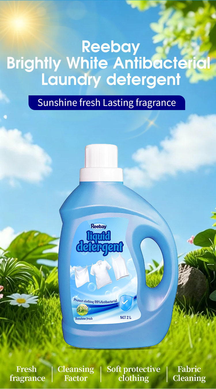 Reebay Brightening and antibacterial laundry detergent with natural fragrance, antibacterial, mite-removing, fabric-protecting, and stain-removing properties.